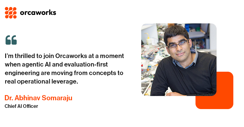 “I’m thrilled to join Orcaworks at a moment when agentic AI and evaluation-first engineering are moving from concepts to real operational leverage,” said Dr. Abhinav Somaraju, Chief AI Officer. “Our focus will be safe, observable and reliable AI systems that integrate with the enterprise stack and prove their value in weeks, not quarters.”